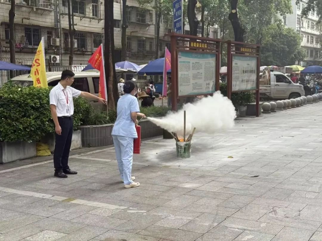 随后,培训人员在院外空旷区域开展灭火器使用实训。讲师现场示范了干粉灭火器的正确操作方法,并指导全体参训人员逐一演练,确保人人掌握、人人能用,切实提升应对突发火情的实战能力。