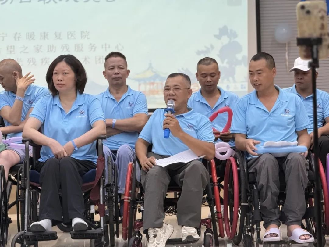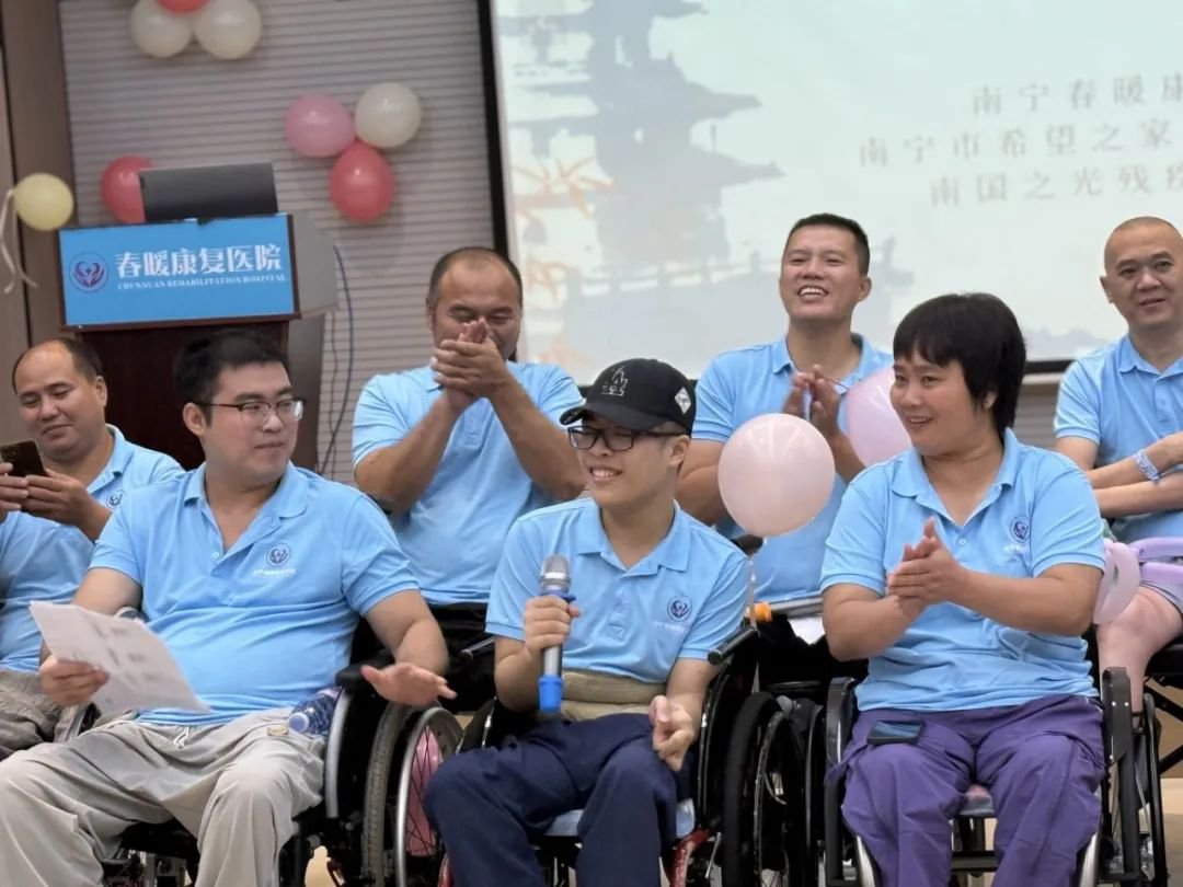 “自强、健康、同行”是第十六个全国肢残人活动日的主题,为了提高公众对肢残人群体关注和重视,理解、尊重、关心、帮助残疾人,促进残疾人事业的发展,2025年8月10日晚,南宁春暖康复医院一楼多功能会议室内灯火璀璨,暖意融融。由南宁春暖康复医院联合南宁市希望之家、南国之光残疾人艺术团共同主办的“携手同行·自助互助”肢残人活动日主题联欢晚会温情上演。脊髓损伤自助互助培训班学员、医院医护人员、康复工作者、艺术团演员、志愿者及家属等欢聚一堂,在第16个全国肢残人活动日到来之际,以艺术为媒,唱响生命强音。
