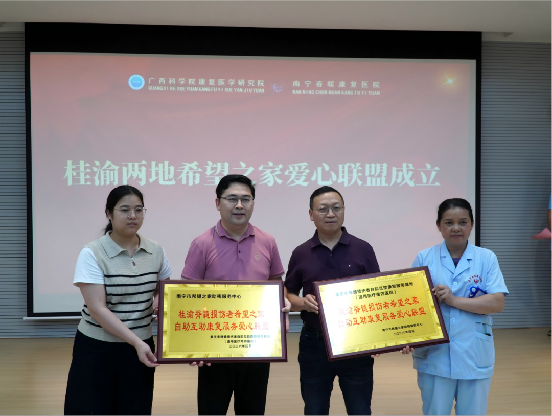 随后,在全场代表的共同见证下,“桂渝脊髓损伤者希望之家自助互助康复服务爱心联盟”正式成立。联盟的建立标志着两地将在康复服务、人才培养、文化共建等领域开展更加紧密的合作。