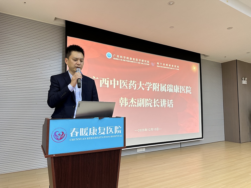 瑞康医院韩杰副院长在讲话中对双方合作给予充分肯定。他表示,南宁春暖康复医院在康复医疗领域有着鲜明的特色和良好的基础。双方合作有利于资源共享与优势互补,瑞康医院将全力支持医联体建设,通过专家下沉、技术帮扶、双向转诊等多种形式提供助力,协同发展、互利共赢,共同为健康广西建设贡献力量。